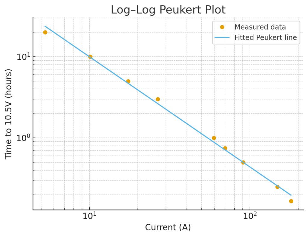 Well, the answer is, it depends. Batteries work on chemical reactions and will never follow Peukert’s Law perfectly, and the test points will have some margin of error in them.