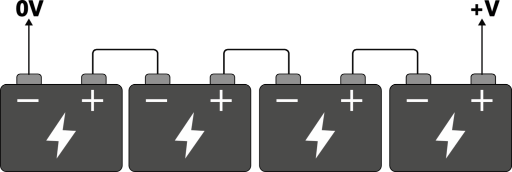 There are 4 battery blocks here with the positive of the first, connected to the negative of the next and so on. This is a single battery string. If each battery block is 12V and a capacity of 9Ah, then the voltage between +V and 0V would be 48V, but the capacity would remain the same at 9Ah. The amount of blocks can be any number and every time you add a block the voltage increases and the capacity remains the same. You must always use the same type of block in a battery string.