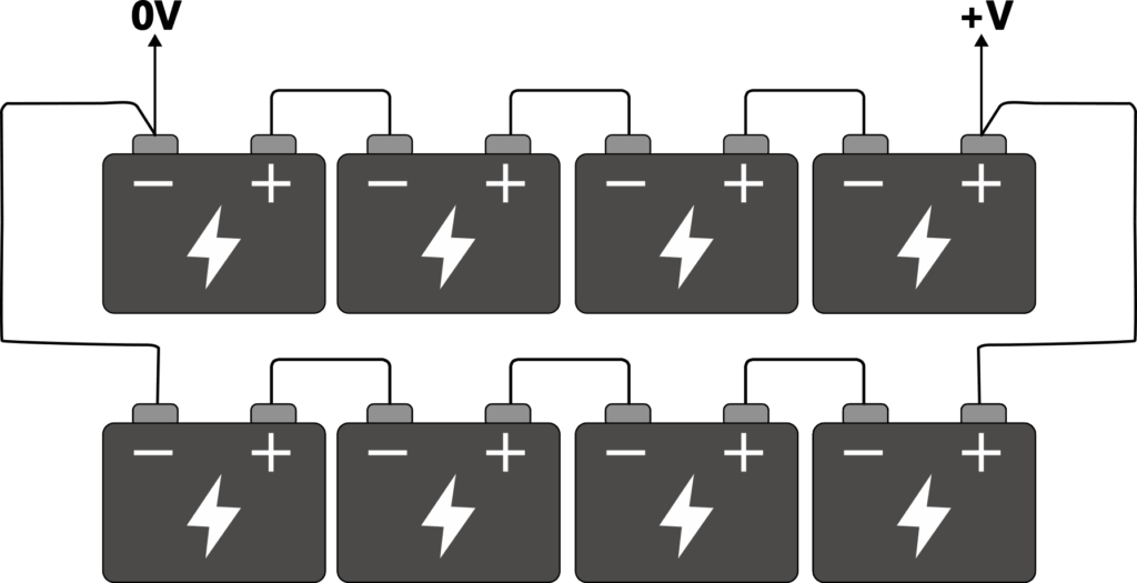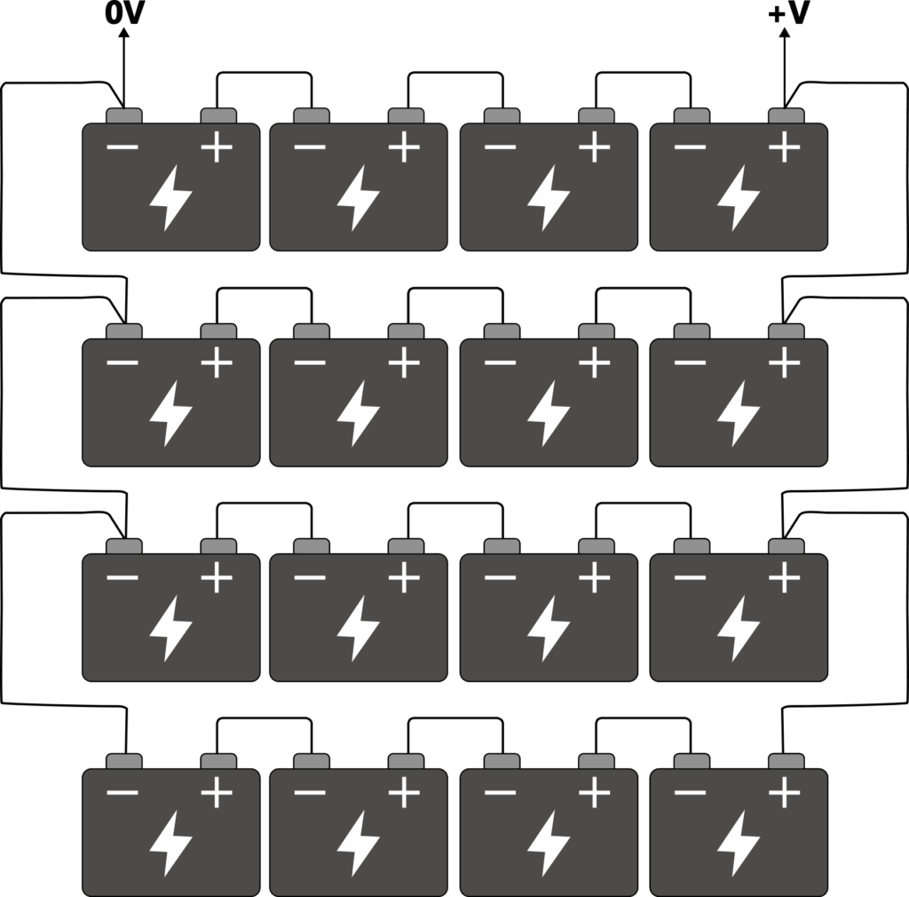 Now if we add another identical string and connect the first negatives and last positives, now we have a system with 2 strings. The voltage at +V has not changed (e.g. in this case it is still 48V), but the capacity has now doubled (e.g. 18Ah). In order to communicate the makeup of the string we could refer to it as a 4S2P string, 4 in series, 2 in parallel. We can keep going in order to increase capacity to meet requirements.