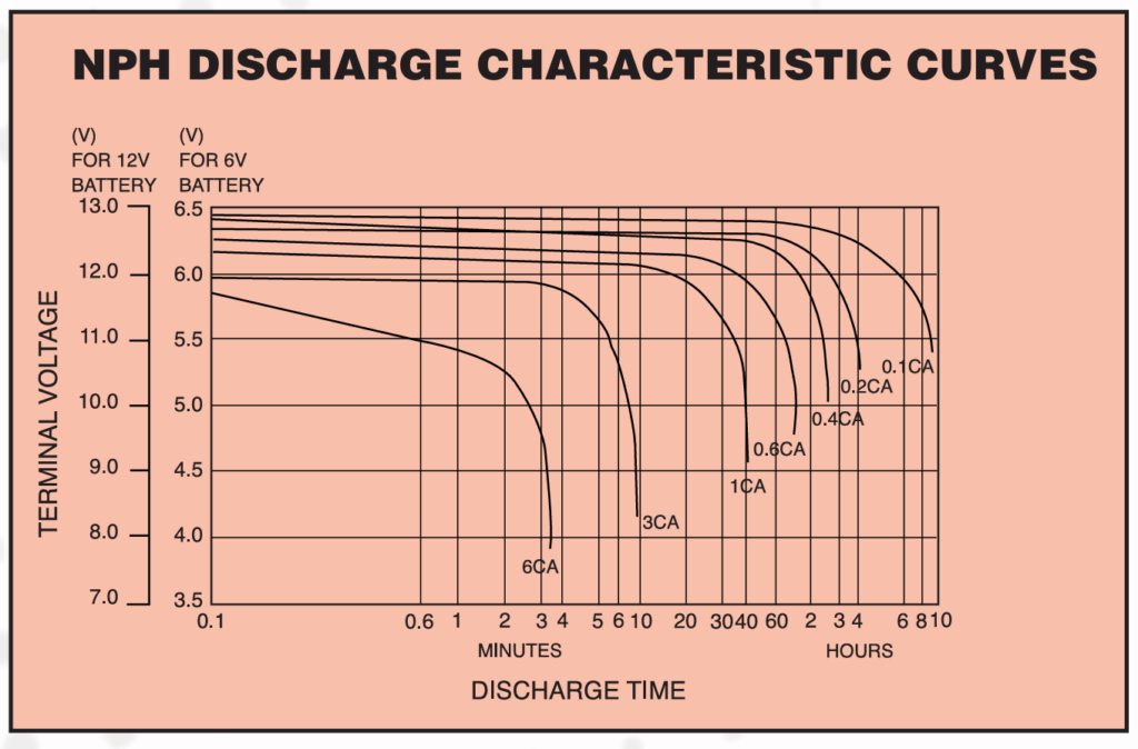 Take a look at the chart above taken from the Yuasa NPH range of batteries. You can see that at 1CA (1 x the capacity, so for a 7Ah block this would be 7A), the amount of time it will provide power for is in fact 40 minutes and not 1 hour.